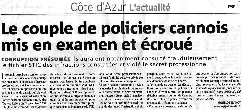 | Le couple de policiers cannois, soupçonné dans une affaire de corruption présumée et de violation du secret professionnel, a été mis en examen très tôt hier matin, après avoir été longuement entendu dans la nuit de jeudi à vendredi par les juges d'instruction, Catherine Bonnici et Sandrine André (lire nos éditions du 17décembre 2009). S. M., la jeune femme de 32 ans, officier | de police judiciaire au quart du commissariat de Cannes, a été mise en examen pour faux en écriture publique et consultation frauduleuse du STIC (système de traitement des infractions constatées). T R, son époux de 33 ans, affecté à la brigade de nuit, a quant à lui été mis en examen pour complicité de faux en écriture publique, consultation frauduleuse du STIC, | violation du secret professionnel, atteinte à l'intimité de la vie privée par diffusion d'images et corruption. À l'issue de leur présentation devant la juge des libertés et de la détention, vers quatre heures et demi du matin, tous deux ont été écroués à la maison d'arrêt de Draguignan pour elle et de Toulon pour lui, conformément à la demande des juges d'instruction et du |