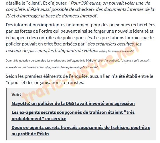 "Selon une source proche de l'enquête, l'agent avait noué des contacts avec des membres du monde de la criminalité organisée ainsi qu'avec des spécialistes de l'intelligence économique intéressés par l'obtention de telles données. [...] Le ripou présumé, en poste dans les Hauts-de-Seine, est également soupçonné d'avoir eu un rôle actif dans la confection de faux documents administratifs."