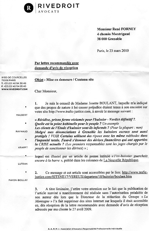 Le 2 mars 2010, après sa demi-heure de menaces téléphoniques votre avocat n'a visiblement pas compris que les français en ont marre de cette délinquance financière en col blanc qui bénéficie d'une quasi impunité ou avec un culot monstre certains comme vous se présentent aux élections (page 18) en utilisant l'argent volé à des victimes qui sont très souvent acculées au suicide où à la déprime à la suite d'abus de pouvoir. La plupart devrait être jugé devant les assises et non en correctionnelle car ce sont des assassins.