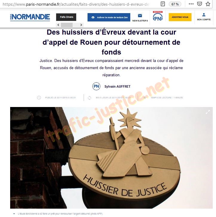 Des huissiers d'Évreux devant la cour d'appel de Rouen pour détournement de fonds Justice. Des huissiers d'Evreux comparaissaient mercredi devant la cour d'appel de Rouen, accusés de détournement de fonds par une ancienne associée qui réclame réparation. Sylvain AUFFRET Publié le 23/11/2019 à 05:01 Mis à jour le 23/11/2019 à 05:01