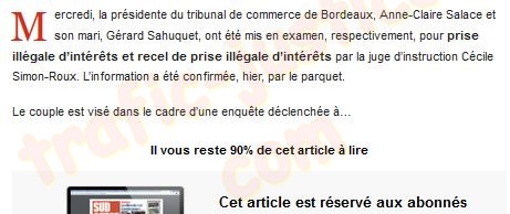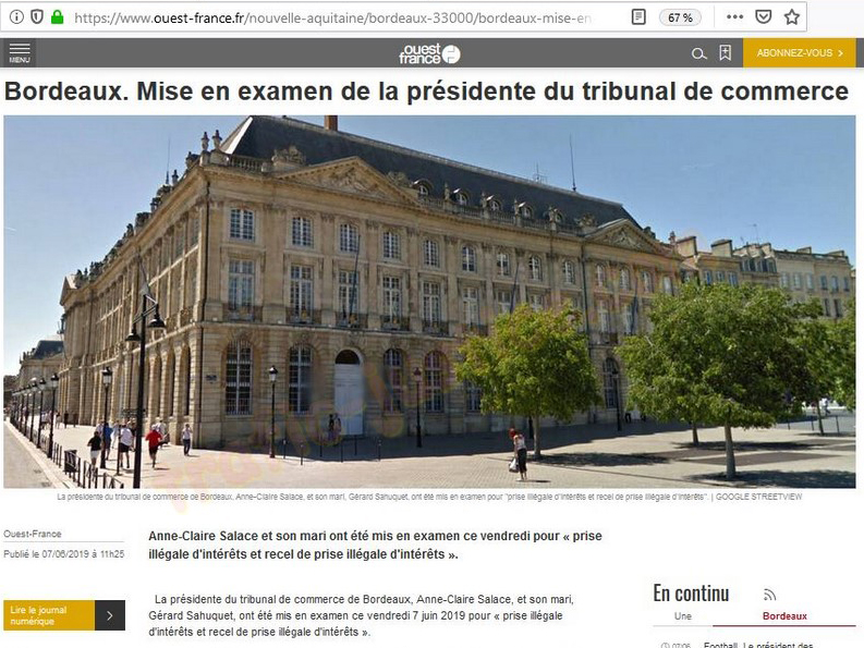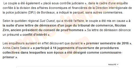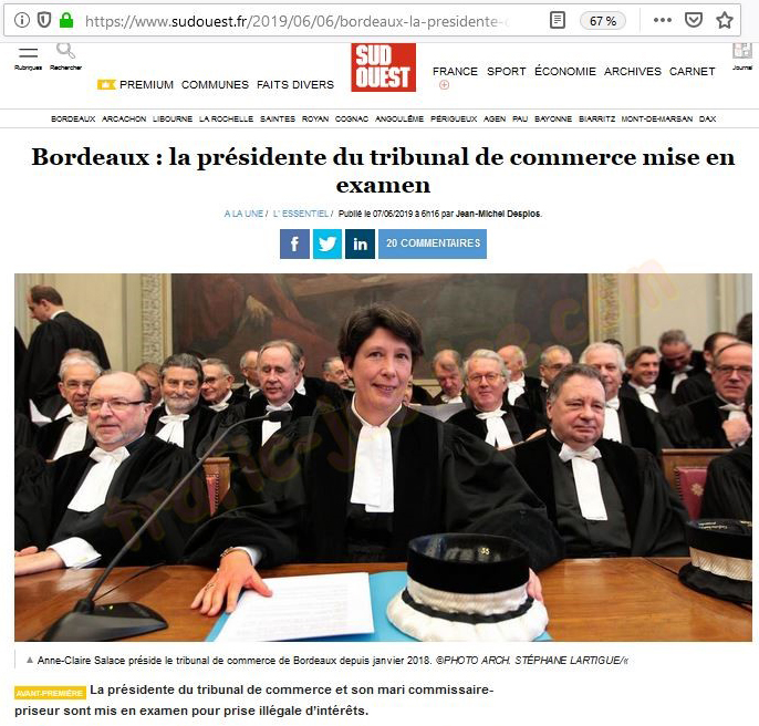 | Ces juges et mandataires qui profitent de leur position pour piller la populations sont légions. Ils profitent de la connivence entre confrères qui les juges en toute impunité ! Comme celle-ci https://journal.ouest-france.fr/ Édition du 08 juin 2019 Bordeaux. Mise en examen de la présidente du tribunal de commerce La présidente du tribunal de commerce de Bordeaux, Anne-Claire Salace, et son mari, Gérard Sahuquet, ont été mis en examen pour "prise illégale d'intérêts et recel de prise illégale d'intérêts". Ouest-France Publié le 07/06/2019 à 11h25 La présidente du tribunal de commerce de Bordeaux, Anne-Claire Salace, et son mari, Gérard Sahuquet, ont été mis en examen ce vendredi 7 juin 2019 pour « prise illégale d'intérêts et recel de prise illégale d'intérêts ». Le couple a été également « placé sous contrôle judiciaire », dans le cadre d'une enquête confiée à la division des affaires économiques et financières de la Direction interrégionale de la police judiciaire (DIPJ) de Bordeaux, a indiqué le parquet, sans autres commentaires. Selon le quotidien régional Sud Ouest , qui a révélé l'affaire, le couple a été mis en cause « à la suite d'une lettre de démission d'un juge du tribunal de commerce, Nicolas Zirn, ancien président du conseil de prud'hommes » . Sa lettre de démission dénonce un présumé « conflit d'intérêt » . Les enquêteurs auraient en effet découvert que durant le « premier semestre de 2016 » , Anne-Claire Salace « a participé à 14 jugements d'ouverture de procédures collectives dans lesquelles son époux a été désigné comme commissaire-priseur » . |