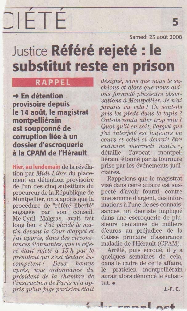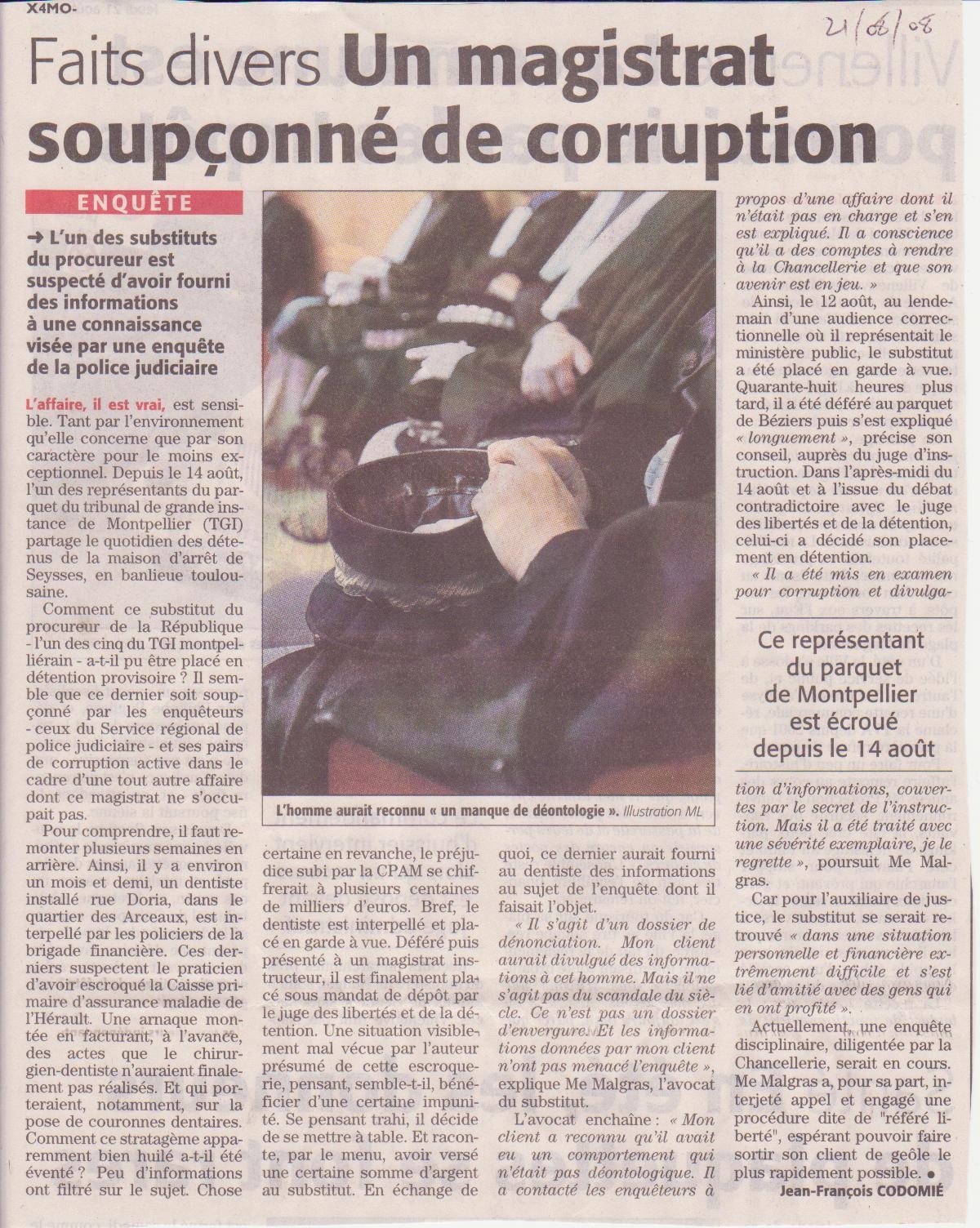 Pour comprendre, il faut remonter plusieurs semaines en arrière. Ainsi, il y a environ un mois et demi, un dentiste installé rue Doria, dans le quartier des Arceaux, est interpellé par les policiers de la brigade financière. Ces derniers suspectent le praticien d'avoir escroqué la Caisse primaire d'assurance maladie de l'Hérault. Une arnaque montée en facturant, à l'avance, des actes que le chirurgien-dentiste n'auraient finalement pas réalisés. Et qui porteraient, notamment, sur la pose de couronnes dentaires. Comment ce stratagème apparemment bien huilé a-t-il été éventé ? Peu d'informations ont filtré sur le sujet. Chose certaine en revanche, le préjudice subi par la CPAM se chiffrerait à plusieurs centaines de milliers d'euros. Bref, le dentiste est interpellé et placé en garde à vue. Déféré puis présenté à un magistrat instructeur, il est finalement placé sous mandat de dépôt par le juge des libertés et de la détention. Une situation visiblement mal vécue par l'auteur présumé de cette escroquerie, pensant, semble-t-il, bénéficier d'une certaine impunité. Se pensant trahi, il décide de se mettre à table. Et raconte, par le menu, avoir versé une certaine somme d'argent au substitut. En échange de quoi, ce dernier aurait fourni au dentiste des informations au sujet de l'enquête dont il faisait l'objet. (voir affaire similaire publiée par Marianne )