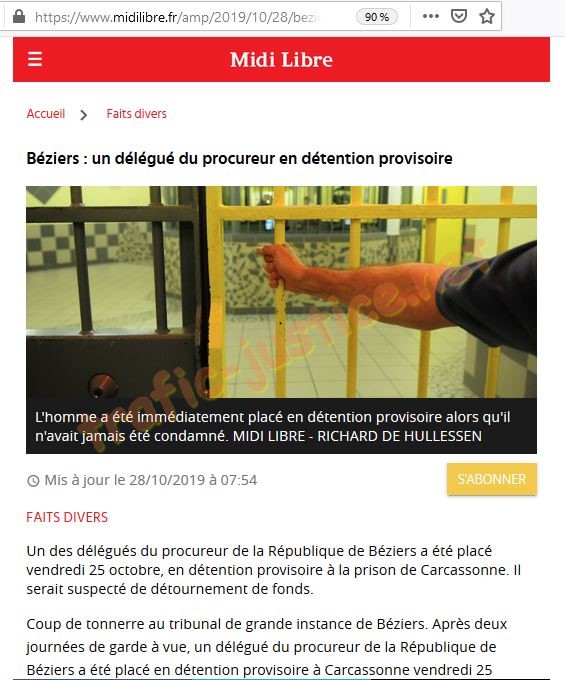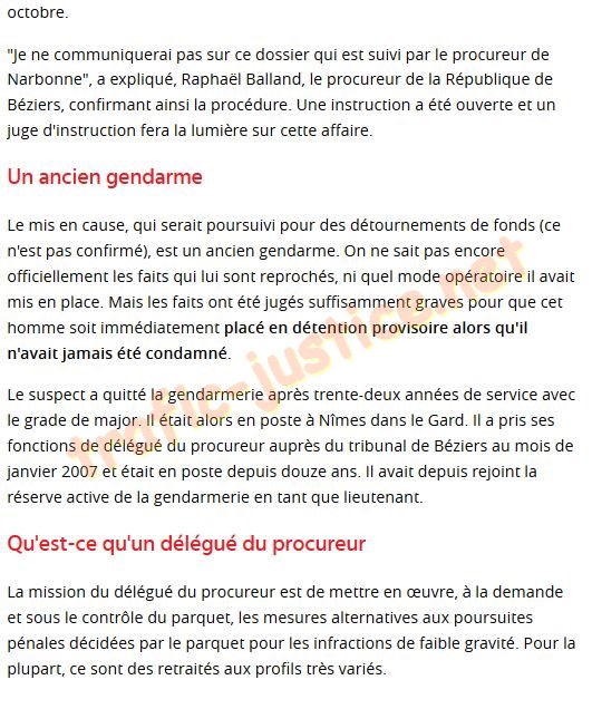 Un des délégués du procureur de la République de Béziers a été placé vendredi 25 octobre, en détention provisoire à la prison de Carcassonne. Il serait suspecté de détournement de fonds. Coup de tonnerre au tribunal de grande instance de Béziers. Après deux journées de garde à vue, un délégué du procureur de la République de Béziers a été placé en détention provisoire à Carcassonne vendredi 25 octobre. "Je ne communiquerai pas sur ce dossier qui est suivi par le procureur de Narbonne", a expliqué, Raphaël Balland, le procureur de la République de Béziers, confirmant ainsi la procédure. Une instruction a été ouverte et un juge d'instruction fera la lumière sur cette affaire. Un ancien gendarme Le mis en cause, qui serait poursuivi pour des détournements de fonds (ce n'est pas confirmé), est un ancien gendarme. On ne sait pas encore officiellement les faits qui lui sont reprochés, ni quel mode opératoire il avait mis en place. Mais les faits ont été jugés suffisamment graves pour que cet homme soit immédiatement placé en détention provisoire alors qu'il n'avait jamais été condamné . Le suspect a quitté la gendarmerie après trente-deux années de service avec le grade de major. Il était alors en poste à Nîmes dans le Gard. Il a pris ses fonctions de délégué du procureur auprès du tribunal de Béziers au mois de janvier 2007 et était en poste depuis douze ans. Il avait depuis rejoint la réserve active de la gendarmerie en tant que lieutenant. Qu'est-ce qu'un délégué du procureur La mission du délégué du procureur est de mettre en ouvre, à la demande et sous le contrôle du parquet, les mesures alternatives aux poursuites pénales décidées par le parquet pour les infractions de faible gravité. Pour la plupart, ce sont des retraités aux profils très variés. J.-P. A. |