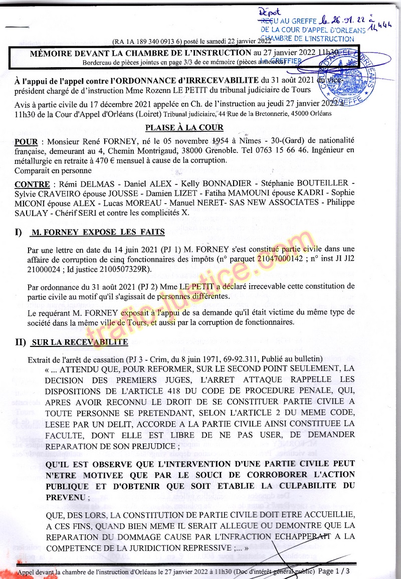 Par une lettre en date du 14 juin 2021 (PJ 1) M. FORNEY s'est constitué partie civile dans une affaire de corruption de cinq fonctionnaires des impôts (n° parquet 21047000142 ; n° inst JI JI2 21000024 ; Id justice 2100507329R).