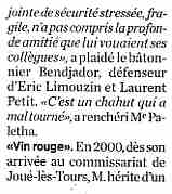 | Retour au début de l'article " ... un policier ... les gardiens de la paix Eric Limouzin et Laurent Petit, ont été condamnés le 7 juillet 2005 à ... six mois ferme pour agression sexuelle commise en réunion. Sa supérieure, Hélène Tafforin... peine d'un ans avec sursis ... " Article de Christophe BOLTANSKI de LIBERATION du 19 janvier 2007 |