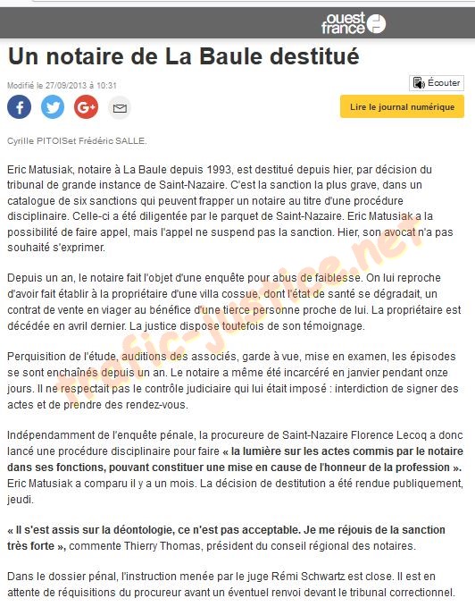 Eric Matusiak, notaire à La Baule depuis 1993, est destitué depuis hier, par décision du tribunal de grande instance de Saint-Nazaire. C'est la sanction la plus grave, dans un catalogue de six sanctions qui peuvent frapper un notaire au titre d'une procédure disciplinaire. Celle-ci a été diligentée par le parquet de Saint-Nazaire. Eric Matusiak a la possibilité de faire appel, mais l'appel ne suspend pas la sanction. Hier, son avocat n'a pas souhaité s'exprimer. Depuis un an, le notaire fait l'objet d'une enquête pour abus de faiblesse. On lui reproche d'avoir fait établir à la propriétaire d'une villa cossue, dont l'état de santé se dégradait, un contrat de vente en viager au bénéfice d'une tierce personne proche de lui. La propriétaire est décédée en avril dernier. La justice dispose toutefois de son témoignage. Perquisition de l'étude, auditions des associés, garde à vue, mise en examen, les épisodes se sont enchaînés depuis un an. Le notaire a même été incarcéré en janvier pendant onze jours. Il ne respectait pas le contrôle judiciaire qui lui était imposé : interdiction de signer des actes et de prendre des rendez-vous. Indépendamment de l'enquête pénale, la procureure de Saint-Nazaire Florence Lecoq a donc lancé une procédure disciplinaire pour faire « la lumière sur les actes commis par le notaire dans ses fonctions, pouvant constituer une mise en cause de l'honneur de la profession ». Eric Matusiak a comparu il y a un mois. La décision de destitution a été rendue publiquement, jeudi. « Il s'est assis sur la déontologie, ce n'est pas acceptable. Je me réjouis de la sanction très forte », commente Thierry Thomas, président du conseil régional des notaires. Dans le dossier pénal, l'instruction menée par le juge Rémi Schwartz est close. Il est en attente de réquisitions du procureur avant un éventuel renvoi devant le tribunal correctionnel. Cyrille PITOIS et Frédéric SALLE. Ouest-France ________________________________________________________________________________