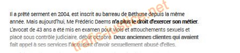 Il a prêté serment en 2004, est inscrit au barreau de Béthune depuis la même année. Mais aujourd'hui, Me Frédéric Daems n'a plus le droit d'exercer son métier . L'avocat de 43 ans a été mis en examen pour viols et attouchements sexuels et placé sous contrôle judiciaire, début octobre. Deux anciennes clientes qui avaient fait appel à ses services l'accusent d'avoir sexuellement abusé d'elles.