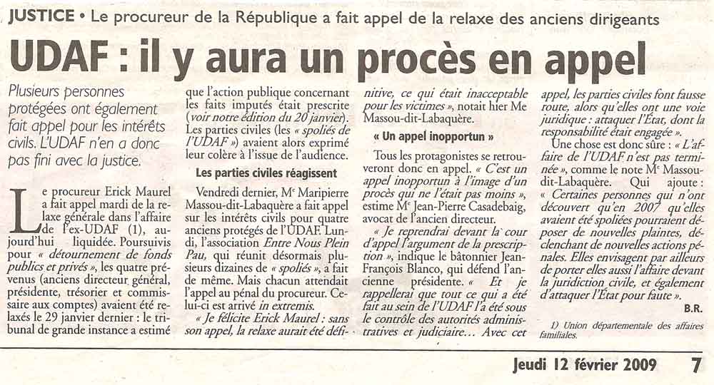 appel, les parties civiles font fausse route, alors qu'elles ont une voie juridique : attaquer l'État, dont la responsabilité était engagée ». Une chose est donc sûre : «L'affaire de l'UDAF n 'est pas terminée », comme le note M` Massoudit-Labaquère. Qui ajoute : « Certaines personnes qui n'ont découvert qu'en 2007 quelles avaient été spoliées pourraient déposer de nouvelles plaintes, déclenchant de nouvelles actions pénales Elles envisagent par ailleurs de porter elles aussi l'affaire devant la juridiction civile, et également (D'attaquer l'État pour faute) ». B.R. 1) Union départementale des affaires familiales. |