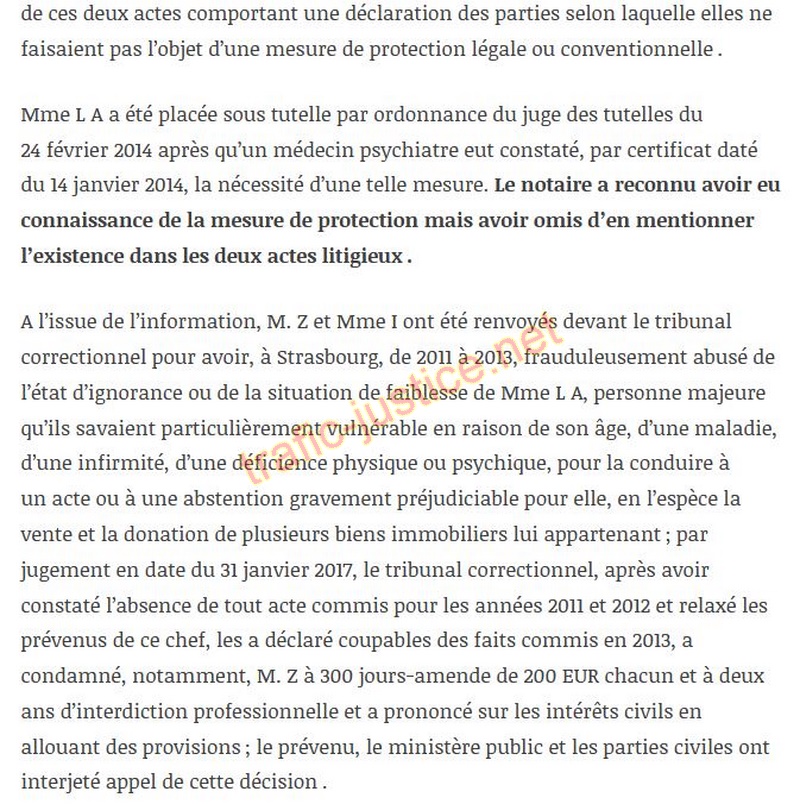 A l'issue de l'information, M. Z et Mme I ont été renvoyés devant le tribunal correctionnel pour avoir, à Strasbourg, de 2011 à 2013, frauduleusement abusé de l'état d'ignorance ou de la situation de faiblesse de Mme L A, personne majeure qu'ils savaient particulièrement vulnérable en raison de son âge, d'une maladie, d'une infirmité, d'une déficience physique ou psychique, pour la conduire à un acte ou à une abstention gravement préjudiciable pour elle, en l'espèce la vente et la donation de plusieurs biens immobiliers lui appartenant?; par jugement en date du 31 janvier 2017, le tribunal correctionnel, après avoir constaté l'absence de tout acte commis pour les années 2011 et 2012 et relaxé les prévenus de ce chef, les a déclaré coupables des faits commis en 2013, a condamné, notamment, M. Z à 300 jours-amende de 200 EUR chacun et à deux ans d'interdiction professionnelle et a prononcé sur les intérêts civils en allouant des provisions?; le prévenu, le ministère public et les parties civiles ont interjeté appel de cette décision?.