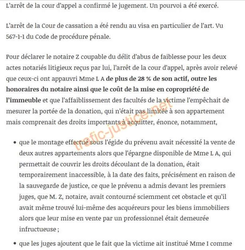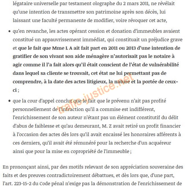 Pour déclarer le notaire Z coupable du délit d'abus de faiblesse pour les deux actes notariés litigieux reçus par lui, l'arrêt de la cour d'appel, après avoir relevé que ceux-ci ont appauvri Mme L A de plus de 28 % de son actif, outre les honoraires du notaire ainsi que le coût de la mise en copropriété de l'immeuble et que l'affaiblissement des facultés de la victime l'empêchait de mesurer la portée de la donation, qui n'était pas limitée à son appartement mais comprenait des droits importants à acquitter, énonce, notamment,