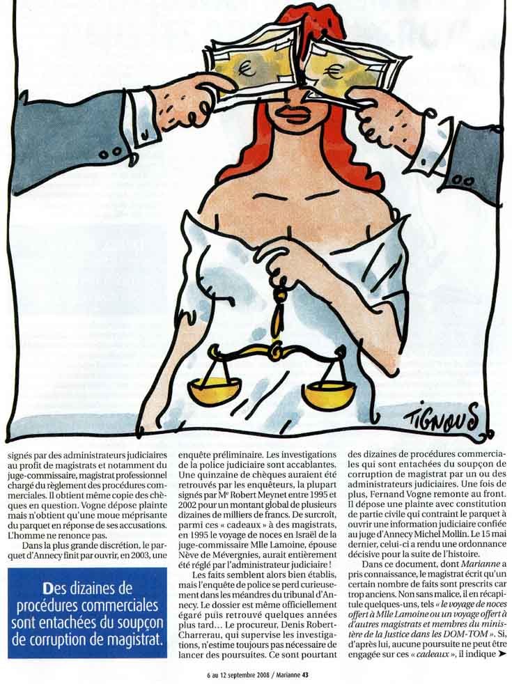 signés par des administrateurs judiciaires au profit de magistrats et notamment du juge-commissaire, magistrat professionnel chargé du règlement des procédures commerciales. Il obtient même copie des chèques en question. Vogne dépose plainte mais n'obtient qu'une moue méprisante du parquet en réponse de ses accusations. L'homme ne renonce pas. Dans la plus grande discrétion, le parquet d'Annecy finit par ouvrir, en 2003, une |