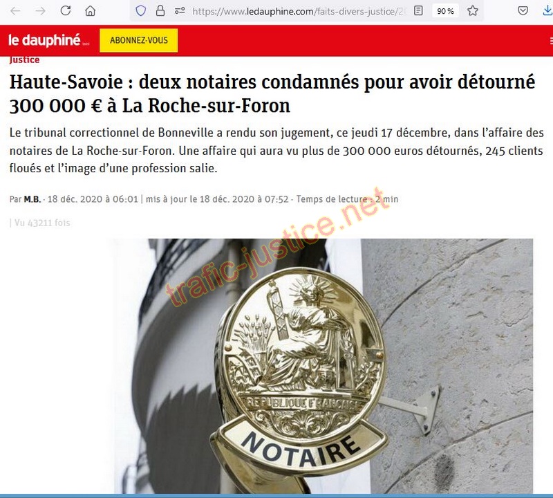 Justice Haute-Savoie : deux notaires condamnés pour avoir détourné 300 000 € à La Roche-sur-Foron Le tribunal correctionnel de Bonneville a rendu son jugement, ce jeudi 17 décembre, dans l'affaire des notaires de La Roche-sur-Foron. Une affaire qui aura vu plus de 300 000 euros détournés, 245 clients floués et l'image d'une profession salie. Par M.B. - 18 déc. 2020 à 06:01 | mis à jour le 18 déc. 2020 à 07:52 - Temps de lecture : 2 min