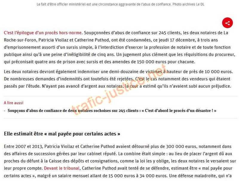C'est l'épilogue d'un procès hors-norme . Soupçonnées d'abus de confiance sur 245 clients, les deux notaires de La Roche-sur-Foron, Patricia Viollaz et Catherine Puthod, ont été condamnées, ce jeudi 17 décembre, à trois ans d'emprisonnement assorti d'un sursis simple, à l'interdiction d'exercer la profession de notaire et de toute fonction publique ainsi qu'à une peine d'inéligibilité de cinq ans. Un jugement plus clément que les réquisitions du procureur, qui préconisait quatre ans de prison avec sursis et des amendes de 150 000 euros pour chacune. Les deux notaires devront également indemniser une demi-douzaine de victimes à hauteur de près de 10 000 euros. De nombreuses demandes d'indemnités ont toutefois été rejetées. C'est le cas notamment des vendeurs qui étaient passés par l'étude. N'ayant pas avancé d'argent aux notaires, la cour a estimé qu'ils n'avaient subi aucun préjudice. A lire aussi Soupçons d'abus de confiance de deux notaires rochoises sur 245 clients : « C'est d'abord le procès d'un désastre ! » Elle estimait être « mal payée pour certains actes » Entre 2007 et 2013, Patricia Viollaz et Catherine Puthod avaient détourné plus de 300 000 euros, notamment dans des affaires de succession gérées par leur cabinet réputé. La combine était simple : au lieu de placer l'argent dû aux proches du défunt à la Caisse des dépôts et consignations, comme la loi les y oblige, les deux notaires le versaient sur leur propre compte. Devant le tribunal , Catherine Puthod avait tenté de se défendre, estimant être « mal payée pour certains actes », malgré un salaire mensuel allant de 15 000 euros à 34 000 euros. Une défense maladroite, qui n'a pas convaincu les juges. 16 octobre 2020 à 06:26 |