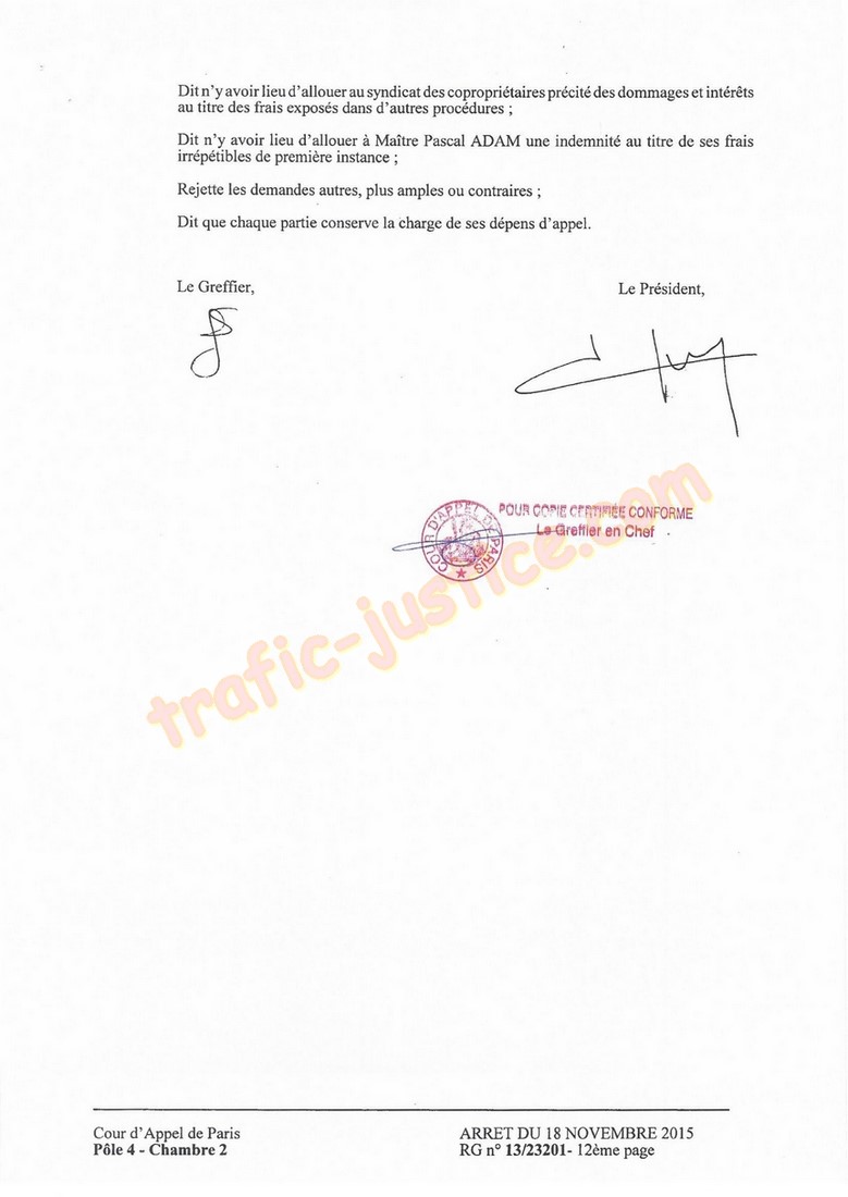 de cause de Maître Pascal ADAM, les dommages et intérêts alloués au syndicat à hauteur