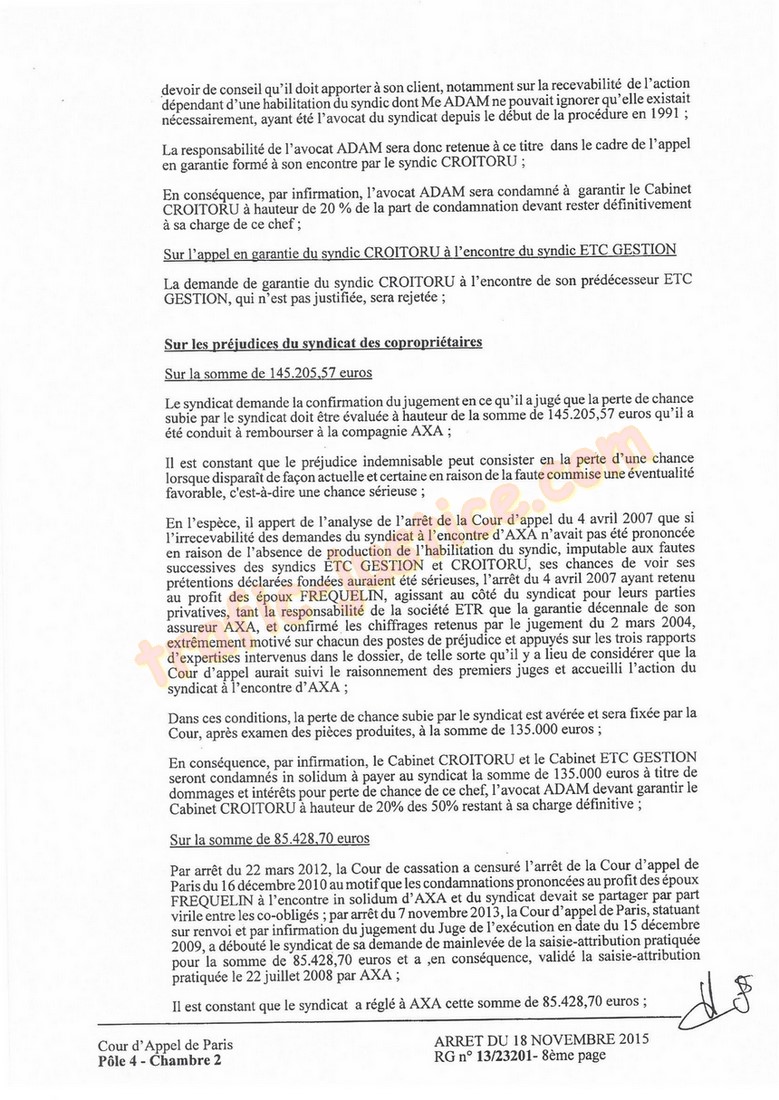 Par infrmation, lavocat ADAM sera condamné à garantir le syndic CROITORU de cette