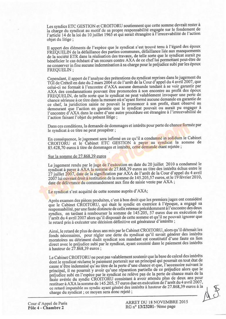 syndic CROITORU en raison du retard à restituer les fonds à AXA et le préjudice dont il