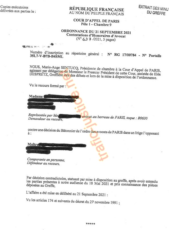 RÉPUBLIQUE FRANÇAISE AU NOM DU PEUPLE FRANÇAIS COUR D'APPEL DE PARIS ORDONNANCE DU 21 SEPTEMBRE 2021 Numéro d'inscription au répertoire général N° RG 17/00784 - N° Portalis 35L7-V-B7B-B4SM L NOUS, Maric-Ange SETUCQ, Présidente de chambre à la Cour d'Appel de PARIS, agissant par délégation de Monsieur le Premier Président de cette Cour, assistée de Eléa DESPRETZ, Grcffière lors des débats et lors de la mise à disposition de l'ordonnance. Vu le recours formé par : Madame René DALMASSO Représentée par Me Alain ABITAN avocat au barreau de PARIS, toque : B0630 Demandeur au recours. contre une décision du Bâtonnier de l'ordre des avocats de PARIS dans un litige l'opposant à : Maitre Anne Laure COMPOINT Comparante en personne, Défendeur au recours. Par décision contradictoire, statuant par mise à disposition au greffe, après avoir entendu les parties présentes à notre audience du 18 Mai 2021 et pris connaissance des pièces déposées au Greffe, L'affaire a été mise en délibéré au 21 Septembre 2021 ***** |