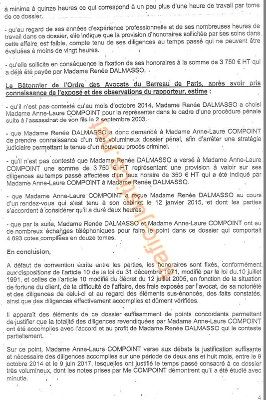 Elle soutient avoir adressé à Madame-DALMASSO une note d'honoraires provisionnelle le 27 octobre 2014, réexpédiée à sa demande le 23 juin 2016 au regard des missions qui viennent d'être décrites et alors que le dossier pénal comprenait 4693 côtes soit plus de 12 tomes, qui lui ont été remis le 12 janvier 2015 lors du rendez-vous afin qu'elle étudie l'entier dossier. Elle souligne ,voir reçu de Madame DALMASSO des appels sur son téléphone portable à différentes reprises et avoir fait l'analyse de l'entier dossier ce qui lui a permis d'indiquer à Madame DALMASSO lors d'un entretien téléphonigue sa position défavorable â la mise en oeuvre de la responsabilité de Madame BERNARE, magistrat, position à laquelle Madame DALMASSO a fini par se rallier. Elle précise que Madame DALMASSO éloignée géographiquement, restait de longs mois sans l'appeler puis la contactait pour lui transmettre des idées procédurales comme en témoignent certains de ses courriers. Maître COMPOINT affirme avoir travaillée vingt heures sur ce dossier volumineux aux lourds enjeux et avoir communiqué sa note d'honoraires avec un courrier d'accompagnement le 27 octobre 2014 puis une nouvelle fois le 23 juin 2016. Elle précise avoir été contactée par Laurent DALMASSO le 15 janvier 2021 pour tenter de trouver un accord, ce à quoi elle n'a pas souhaité donner suite. SUR QUO1, Selon les dispositions de l'article 10 de la loi du 31 décembre 1971, modifiées par la loi du 10 juillet 1991, à défaut de convention écrite entre les parties, les honoraires sont fixés en fonction de la situation de fortune du client, de la difficulté de l'affaire, des frais exposés par l'avocat, de sa notoriété et des diligences de celui-ci. Selon les dispositions de l'article 10 modifié du Décret du 12 juillet 2005, l'avocat informe son client, dès sa saisine, des modalités de détermination des honoraires couvrant les diligences prévisibles et de l'ensemble des frais, débours et émoluments qu'il pourrait exposer. L'avocat peut recevoir d'un client des honoraires de manière périodique, y compris sous forme forfaitaire. Il est constant que Maitre COMPOINT été mandatée par Madame DALMASSO au mois d'octobre 2014 jusqu'à son dcssaisisement intervenu aumois de juillet 2017, pour prendre connaissance d'un dossier criminel comportant 4693 idées côtées, ouvert à la suite de l'assassinat de son fils, Monsieur Christian DALMASSO, perpétré le 2 septembre 2013. Madame DALMASSO a confié à Maître COMPOINT l'étude d'un dépôt de plainte pour faux en écriture publique à l'encontre du magistrat exerçant les fonctions de président de la chambre de l'instruction à la cour d'appel d'Aix en Provence, à la suite de l'arrêt rendu le 2 octobre 2007 ayant dit n'y avoir lieu à suivre contre quatre des personnes mises en accusation mais également afin d'étudier la possibilité de faire réviser le procès ou de le faire rouvrir pour fait nouveau. Maître COMPOINT justifie à l'appui de sa demande une fiche de diligences de 11 pages recto, comportant des notes manuscrites écrites par elle. Elle produit !'ensemble du dossier pénal. Elle indique avoir adressé 2 courriers mais n'en justifie pas. Elle indique également avoir reçu 5 courriers de 2 à 5 pages, ce qui est attesté par Madame Cour d'Appel de Paris ORD du 21Septembre 021 |