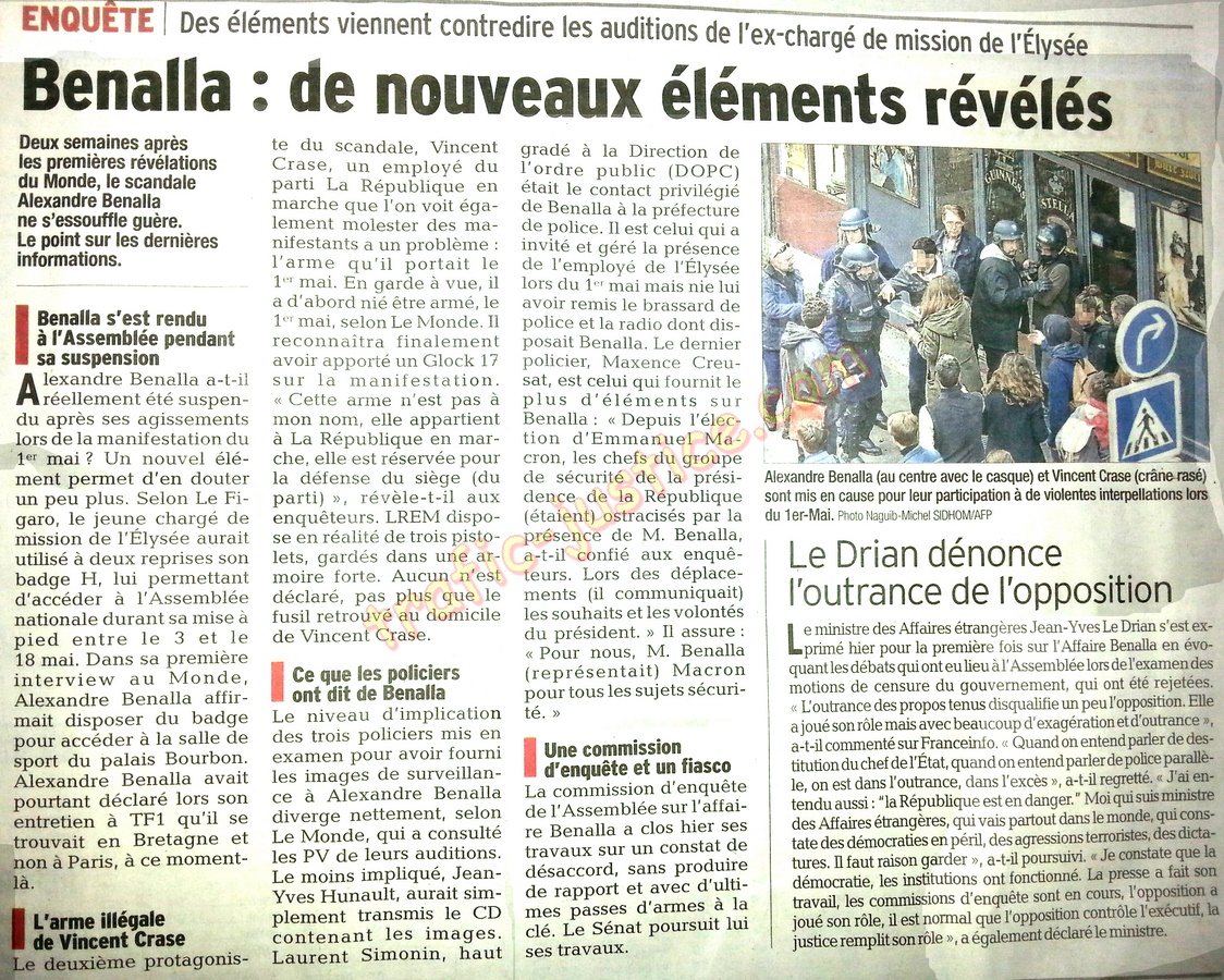 à la Direction de l'ordre public (DOPC) était le contact privilégié de Benalla à la préfecture de police. Il est celui qui a invite et gère la présence de l'employé de l'Elysée lors du 1er mai mais nie lui avoir remis le brassard de police et la radio dont disposait Benalla. Le dernier policier, Maxence Creusat, est celui qui fournit le plus d'éléments sur Benalla : « Depuis l'élection d'Emmanuel Macron, les chefs du groupe de sécurité de la présidence de la République (étaient) ostracises par la présence de M. Benalla, a-t-il confie aux enquêteurs. Lors des déplacements (il communiquait) les souhaits et les volontés du président. » Il assure : « Pour nous, M. Benalla (représentait) Macron pour tous les sujets sécurité. »