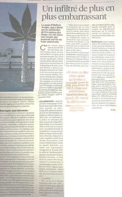 Mais depuis, le commissaire Thierry a été mis en examen pour « complicité de trafic de stupéfiants » et la procédure distincte basée sur les révélations d'Avoine, dépaysée à Lyon, inquiète au plus haut niveau, Pour preuve, cette écoute téléphonique versée au dossier Judiciaire, qui relate une conversation enregistrée le 23 août 2017, la veille de l'audition fatidique du commissaire Thierry. Patrick Laberche, le bras droit du patron des Stups, contacte un certain Rick, le correspondant auprès de l'office de la DEA,1'agence antidrogue américaine. « Salut Rick, ça va ? attaque Laberche. Tu as le bonjour de François.