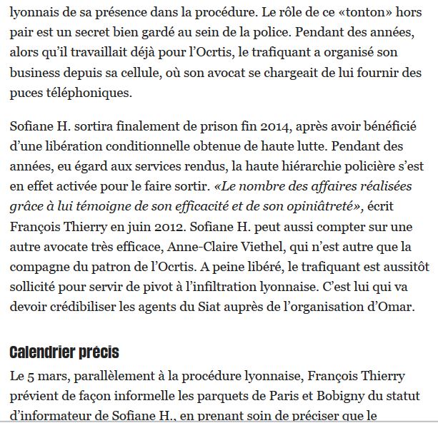 Sofiane H. sortira finalement de prison fin 2014, après avoir bénéficié d'une libération conditionnelle obtenue de haute lutte. Pendant des années, eu égard aux services rendus, la haute hiérarchie policière s'est en effet activée pour le faire sortir. «Le nombre des affaires réalisées grâce à lui témoigne de son efficacité et de son opiniâtreté», écrit François Thierry en juin 2012. Sofiane H. peut aussi compter sur une autre avocate très efficace, Anne-Claire Viethel, qui n'est autre que la compagne du patron de l'Ocrtis. A peine libéré, le trafiquant est aussitôt sollicité pour servir de pivot à l'infiltration lyonnaise. C'est lui qui va devoir crédibiliser les agents du Siat auprès de l'organisation d'Omar.