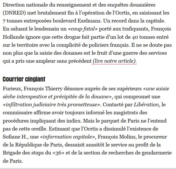 Furieux, François Thierry dénonce auprès de ses supérieurs «une saisie sèche intempestive et précipitée de la douane» , qui compromet une «infiltration judiciaire très prometteuse». Contacté par Libération, le commissaire affirme avoir toujours informé les magistrats des procédures impliquant des indics. Mais le parquet de Paris ne l'entend pas de cette oreille. Estimant que l'Ocrtis a dissimulé l'existence de Sofiane H., une «information capitale», François Molins, le procureur de la République de Paris, dessaisit aussitôt le service au profit de la Brigade des stups du «36» et de la section de recherches de gendarmerie de Paris.
