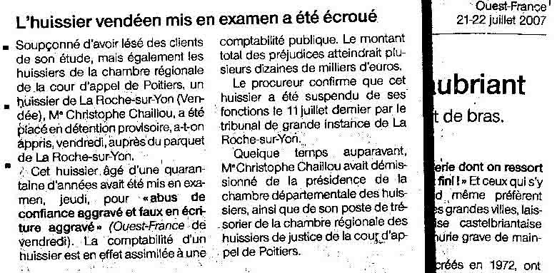 " ...Huissier de la Roche-sur-Yon (Vendée), Me Christophe Chaillou, a été placé en détension provisoire... " |