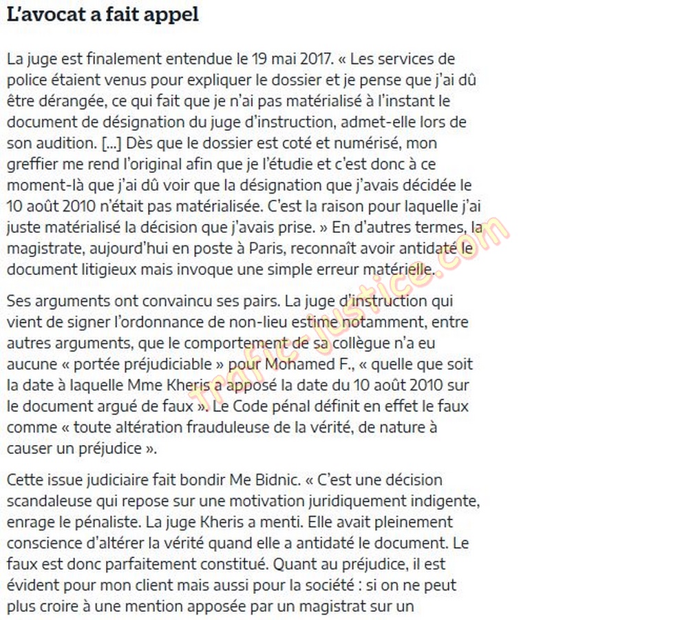 | Ci-dessous, sanction ? Non-lieu ! La suite en 2019 ? Un avocat ose signaler le faux de la juge Sabine Kheris - Erreur bien sûr ? Dans le cas de René FORNEY, le pot de vin de 80.000 euros à un notaire est masqué par toutes les magouilles possibles comme 8 mois en prison après 48 heures de menaces en garde à vue pour obtenir le retrait des dérives signalées sur les sites internet. Un juge signale ces dérives : http://www.juge-domergue.fr.ht/ (extraits) |