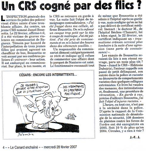 Le Canard du 28/02/07 - un jeune CRS nommé JAMEL victime de graves violences au commissariat de BAGNEUX traumatisme crânien cervical plus lombaire