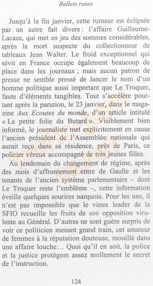 Jusqu'à la fin janvier, cette rumeur est éclipsée par un autre fait divers : l'affaire Guillaume-Lacaze, qui met en jeu des sommes considérables, après la mort suspecte du collectionneur de tableaux Jean Walter. Le froid exceptionnel qui sévit en France occupe également beaucoup de place dans les journaux ; mais aucun patron de presse ne semble pressé de lancer le nom d'un homme politique aussi important que Le Troquer, faute d'éléments tangibles. Tout s'accélère pourtant après la parution, le 23 janvier, dans le magazine Aux Ecoutes du monde, d'un article intitulé « La petite folie du Butard ». Visiblement bien informé, le journaliste met explicitement en cause l'ancien président de l'Assemblée nationale qui aurait reçu dans sa résidence, près de Paris, ce policier véreux accompagné de très jeunes filles.