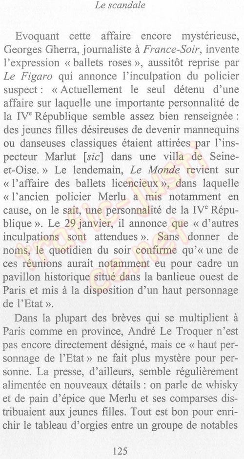 Evoquant cette affaire encore mystérieuse, Georges Gherra, journaliste à France-Soir, invente l'expression « ballets roses », aussitôt reprise par Le Figaro qui annonce I'inculpation du policier suspect : « Actuellement le seul détenu d'une affaire sur laquelle une importante personnalité de la IVe République semble assez bien renseignée : des jeunes filles désireuses de devenir mannequins ou danseuses classiques étaient attirées par l'inspecteur Marlut [sic] dans une villa de Seine-et-Oise. » Le lendemain, Le Monde revient sur « l'affaire des ballets licencieux », dans laquelle « l'ancien policier Merlu a mis notamment en cause, on le sait, une personnalité de la IVe République ». Le 29 janvier, il annonce que « d'autres inculpations sont attendues ». Sans donner de noms, le quotidien du soir confirme qu'« une de ces réunions aurait notamment eu pour cadre un pavillon historique situé dans la banlieue ouest de Paris et mis à la disposition d'un haut personnage de l'Etat ».
