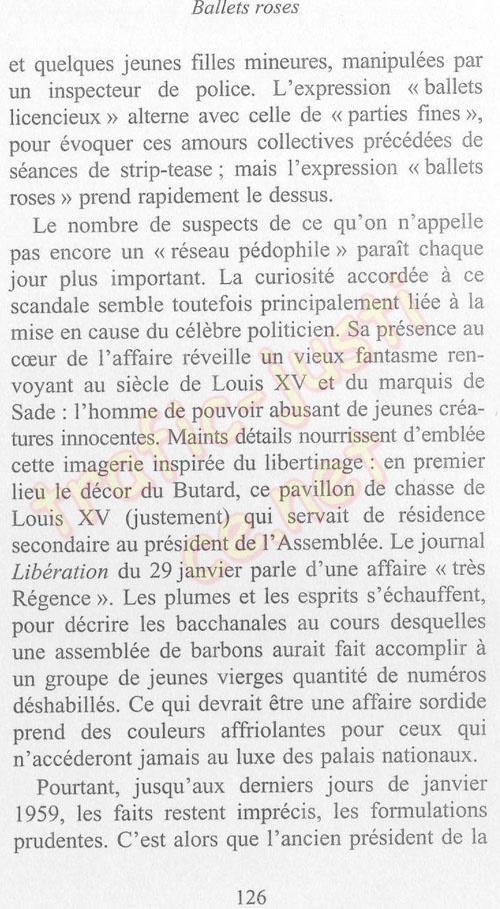 Le nombre de suspects de ce qu'on n'appelle pas encore un « réseau pédophile » paraît chaque jour plus important. La curiosité accordée à ce scandale semble toutefois principalement liée à la mise en cause du célèbre politicien. Sa présence au cœur de l'affaire réveille un vieux fantasme renvoyant au siècle de Louis XV et du marquis de Sade : l'homme de pouvoir abusant de jeunes créatures innocentes. Maints détails nourrissent d'emblée cette imagerie inspirée du libertinage : en premier lieu le décor du Butard, ce pavillon de chasse de Louis XV (justement) qui servait de résidence secondaire au président de l'Assemblée. Le journal Libération du 29 janvier parle d'une affaire «très Régence ». Les plumes et les esprits s'échauffent, pour décrire les bacchanales au cours desquelles une assemblée de barbons aurait fait accomplir à un groupe de jeunes vierges quantité de numéros déshabillés. Ce qui devrait être une affaire sordide prend des couleurs affriolantes pour ceux qui n'accéderont jamais au luxe des palais nationaux.