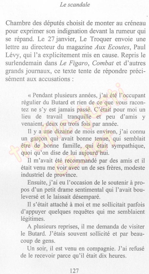 termes de ses dénégations : elles concernent les « fillettes » et autres « figurantes chorégraphiques » devant des « convives sélectionnés ». En revanche il ne réfute pas la visite au Butard de cet entremetteur accompagné de « deux personnes ». Il omet seulement de préciser qu'il s'agissait d'adolescentes, sinon de fillettes. André Le Troquer organise sa défense, mais il est trop tard : la machine judiciaire va le contraindre à aller de recul en recul.