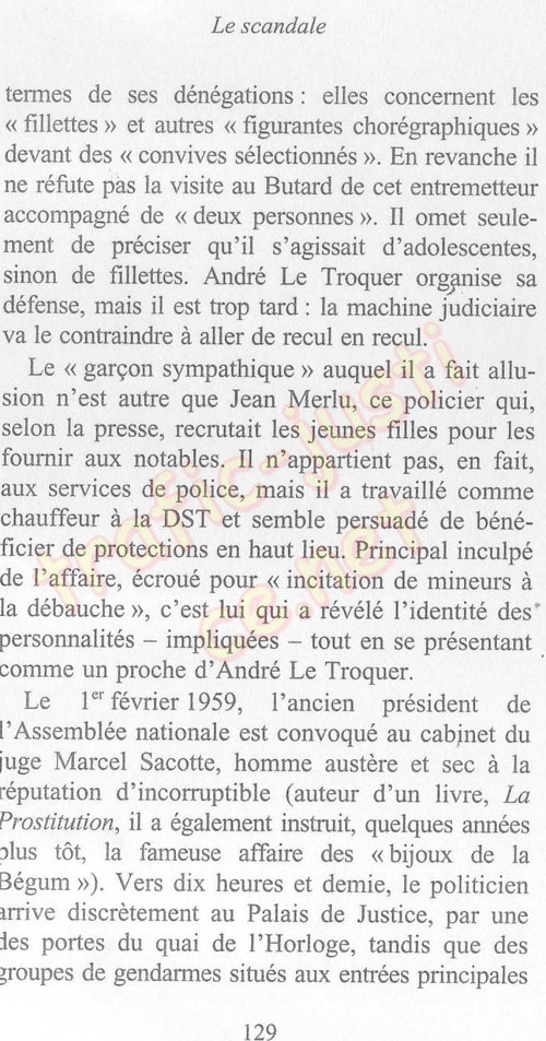 Le « garçon sympathique » auquel il a fait allusion n'est autre que Jean Merlu, ce policier qui, selon la presse, recrutait les jeunes filles pour les fournir aux notables. Il n'appartient pas, en fait, aux services de police, mais il a travaillé comme chauffeur à la DST et semble persuadé de bénéficier de protections en haut lieu. Principal inculpé de l'affaire, écroué pour « incitation de mineurs à la débauche », c'est lui qui a révélé l'identité des" personnalités — impliquées — tout en se présentant comme un proche d'André Le Troquer.