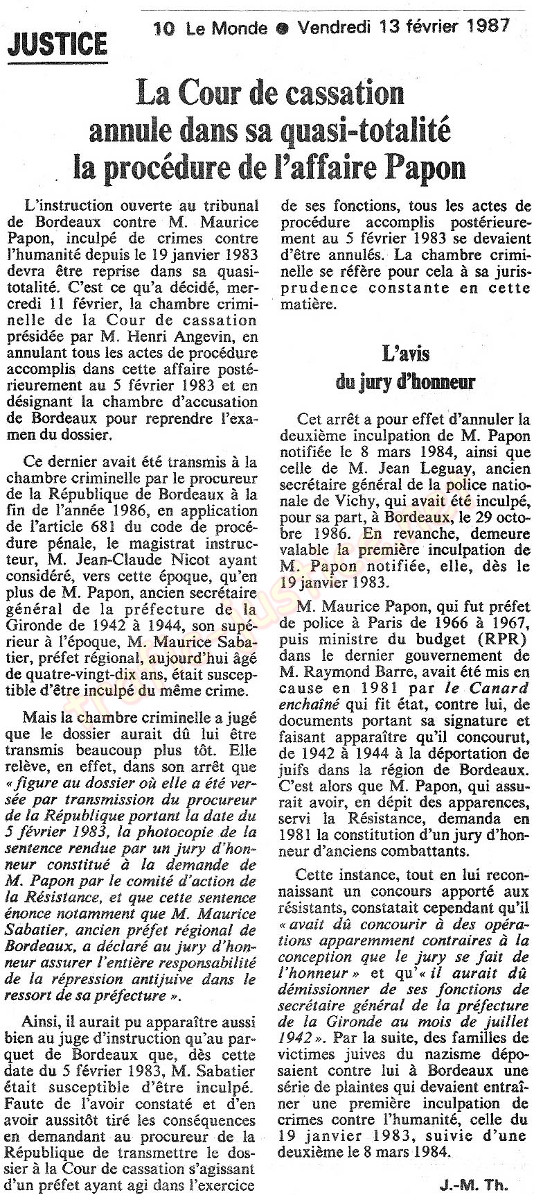 de ses fonctions, tous les actes de procédure accomplis postérieurement au 5 février 1983 se devaient d'être annulés. La chambre criminelle se réfère pour cela à sa jurisprudence constante en cette matière. L'avis du jury d'honneur Cet arrêt a pour effet d'annuler la deuxième inculpation de M. Papon notifiée le 8 mars 1984, ainsi que celle de M. Jean Leguay, ancien secrétaire général de la police nationale de Vichy, qui avait été inculpé, pour sa part, à Bordeaux, le 29 octobre 1986. En revanche, demeure valable la première inculpation de M. Papon notifiée, elle, dès le 19 janvier 1983. M. Maurice Papon, qui fut préfet de police à Paris de 1966 à 1967, puis ministre du budget (RPR) dans le dernier gouvernement de M. Raymond Barre, avait été mis en cause en 1981 par le Canard enchaîné qui fit état, contre lui, de documents portant sa signature et faisant apparaître qu'il concourut, de 1942 à 1944 à la déportation de juifs dans la région de Bordeaux. C'est alors que M. Papon, qui assurait avoir, en dépit des apparences, servi la Résistance, demanda en 1981 la constitution d'un jury d'honneur d'anciens combattants. Cette instance, tout en lui reconnaissant un concours apporté aux résistants, constatait cependant qu'il avait dû concourir à des opérations apparemment contraires à la conception que le jury se fait de l'honneur» et qu'e il aurait dû démissionner de ses fonctions de secrétaire général de la préfecture de la Gironde au mois de juillet 1942 ». Par la suite, des familles de victimes juives du nazisme déposaient contre lui à Bordeaux une série de plaintes qui devaient entraîner une première inculpation de crimes contre l'humanité, celle du 19 janvier 1983, suivie d'une deuxième le 8 mars 1984. J.-M. Th |