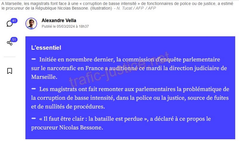 Et cette corruption ne se limiterait pas à la PJ. « Il y a en effet des cabinets qui seraient sujets à beaucoup d'annulations de procédures. Cela peut être de l'incompétence, ou de la corruption. Et nous avons actuellement deux enquêtes en cours à Marseille sur des fonctionnaires de greffe suspectés de renseigner des membres du crime organisé », a précisé Nicolas Bessone qui rappelle que « chaque personne a son prix et que les moyens de ces organisations sont quasiment infinis ».