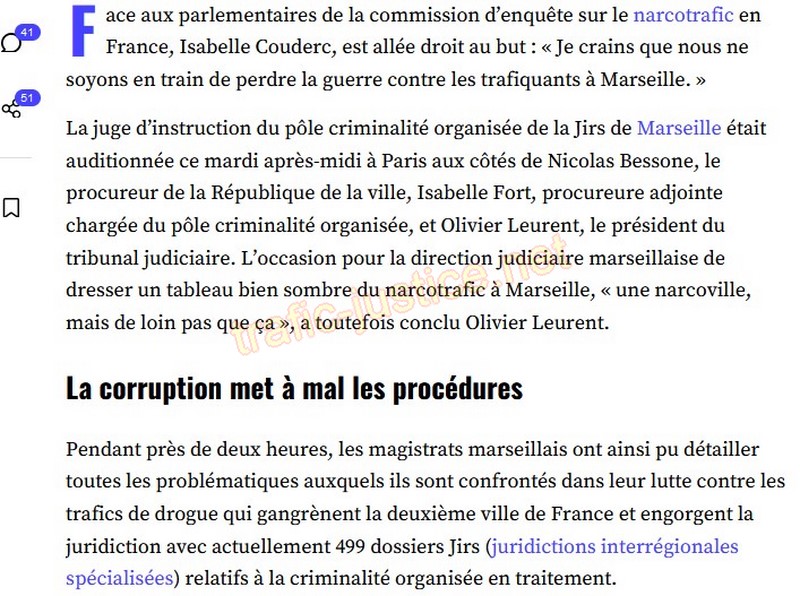 Pendant près de deux heures, les magistrats marseillais ont ainsi pu détailler toutes les problématiques auxquels ils sont confrontés dans leur lutte contre les trafics de drogue qui gangrènent la deuxième ville de France et engorgent la juridiction avec actuellement 499 dossiers Jirs (juridictions interrégionales spécialisées) relatifs à la criminalité organisée en traitement.