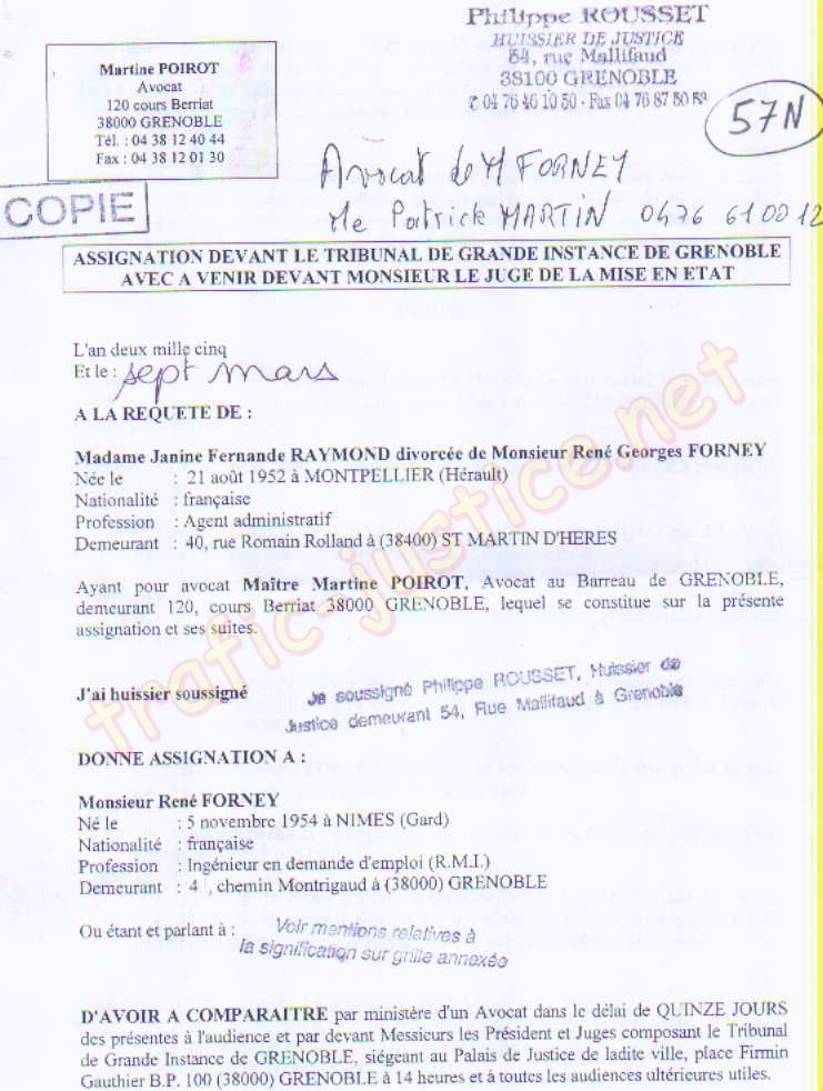 Partage imposé au profit de Mme RAYMOND Janine responsable après l'urbanisme du service des eaux de la Mairie d'Echirolles et de son amant le flic ripou GIRAUD Paul Maurice associé à d'autres ripoux Je croyais avoir enfin un avocat qui semblait (Courte durée - 3 mois !) décidé à mettre fin aux magouilles de ses confrères complices de certains magistrats corrompus du TGI de Grenoble. |