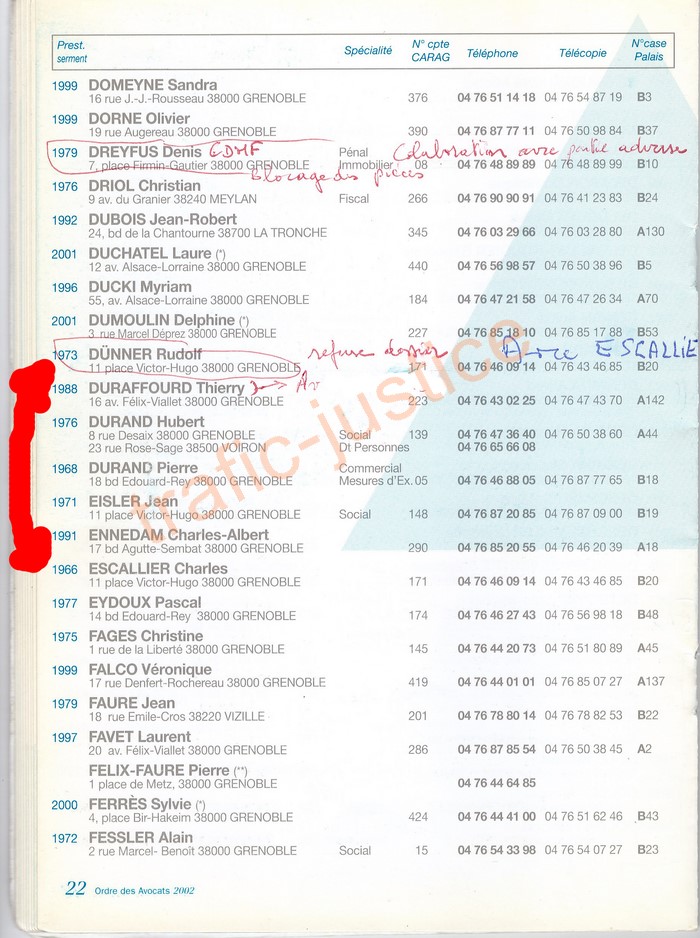 | Après le sabotage de la procédure de divorce par l'avocate Annie BOTTA-AUBERT (René FORNEY jugé sans pièce ni conclusions en mars 2001 !), René FORNEY subissait ensuite le désistement d'Agnès MARTIN (motif trop de pression sur ce dossier). René FORNEY à la recherche d'un avocat ! attendait après trois jours de consultation du dossier par Rudolf DUNNER sa réponse (Je ne peux rien faire pour vous !) M. FORNEY ignorait que le relevé bancaire du débit en espèce (80.000 € valeur 2017) présenté comme un pot-de-vin à Me DUNNER pouvait être passé entre les mains du frère (fallait savoir) avocat (Charles ESCALLIER) du notaire Bruno ESCALLIER. Sachant que M. FORNEY questionne sur ces fonds, il devenait imprudent au notaire de la famille B. E. de poursuivre avec Mme RAYMOND les manipulations sur les biens de la communauté cachées à son époux en instance de divorce . ![]() ![]() |