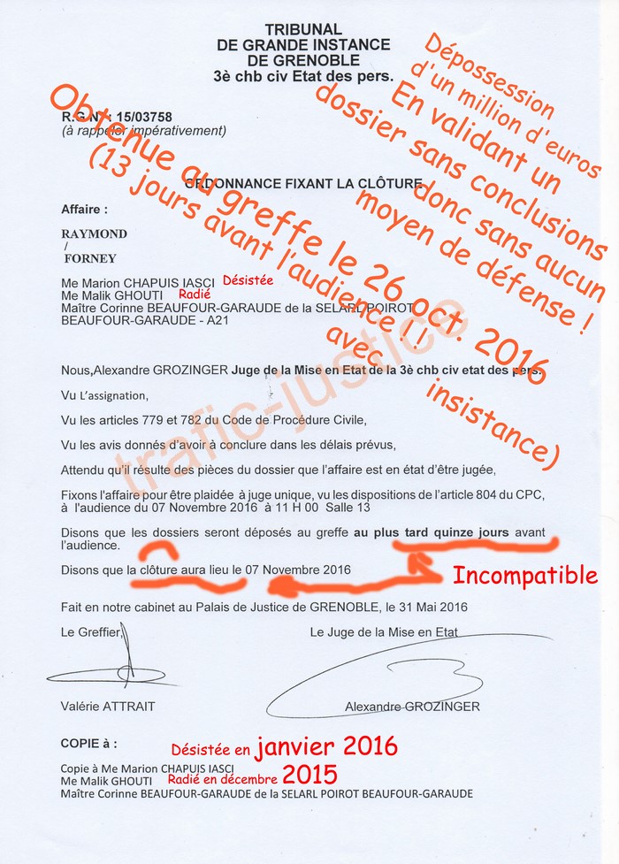 J'ai enfin obtenu le 26 octobre 2016 après les délais légaux une ordonnance datée du 31 mai 2016 transmise au RPVA (Système informatique du palais de justice) par le juge Alexandre GROZINGER. (Copie annotée jointe à votre acceptation). Je constate les refus de réponse écrite de tous les intervenants sur mes conclusions écrites depuis un an qui ne sont donc toujours pas au RPVA.