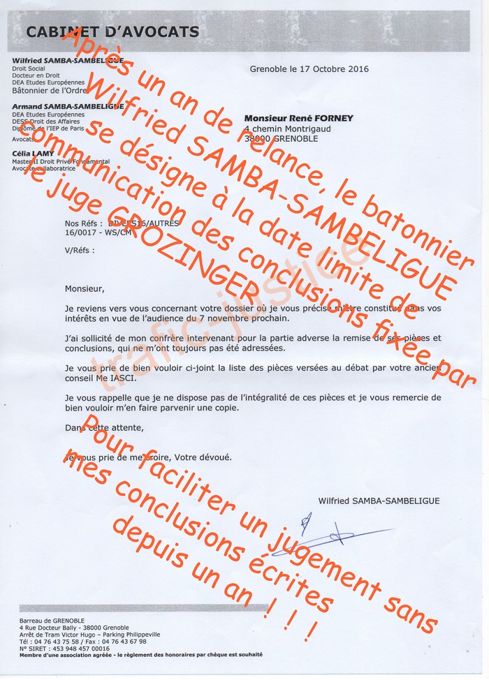 Par tous les moyens de procédure, pendant un an, ce juge Alexandre GROZINGER s'est concerté avec le bâtonnier (Avocat SAMBA) pour faire juger un justiciable sans ses moyens de défense (Ce mafieux est un adepte du même club de Karaté de Chambéry avec les ripoux Bruno CWIKOWSKI et Frédéric DESFONDS, que M. FORNEY dénonce dans ses conclusions qu'il a fait supprimer de la procédure)