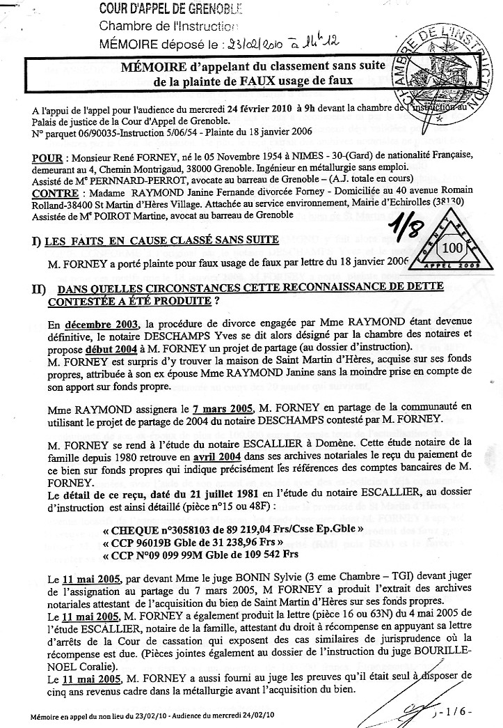 Pièce présentée le 26 avril 2010 - Un mémoire contre un faux expertisé en écriture par un policier de Grenoble : Voir