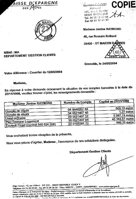 | Accueil Le juge LEGER Jean-Claude truand du réseau ? Pièces jointes aux conclusions d'appel sur une liquidation de communauté à l'origine d'une spoliation par des escrocs en bandes organisées dont des policiers, gendarmes, avocats, avouées, huissiers, experts, notaire, juges ... ? Preuves ci-après |