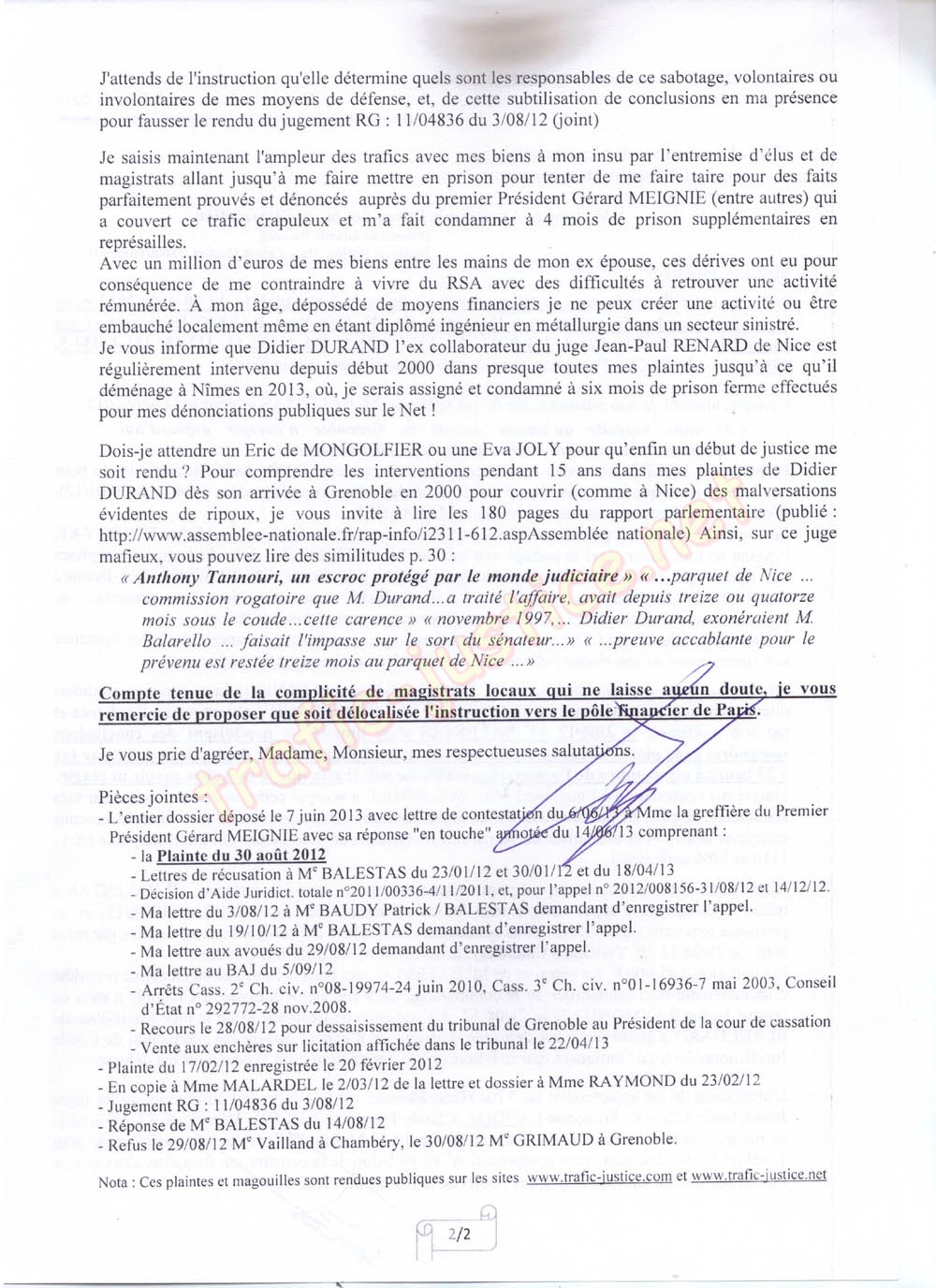 Nota : Ces plaintes et magouilles sont rendues publiques sur les sites www.trafic-justice.com et www.trafic-justice.net/trafic-justice/