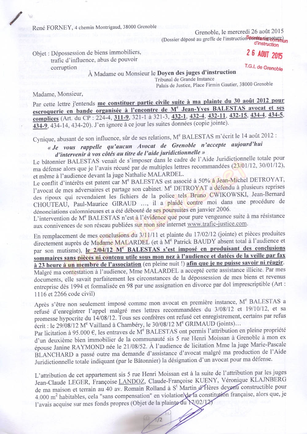 Par cette lettre j'entends me constituer partie civile suite à ma plainte du 30 août 2012 pour escroquerie en bande organisée à l'encontre de Me Jean-Yves BALESTAS avocat et ses complices (Art. du CP : 224-4, 311-9 , 321-1 à 321-3, 432-1 , 432-4 , 432-11 , 432-15 , 434-4 , 434-5 , 434-9 , 434-14, 434-20). J'en ignore à ce jour les suites données (copie jointe).
