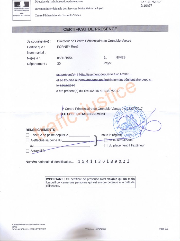 Un jugement du 14 décembre 2016, confirmé par l'arrêt 296 du 15 mars 2017 (Magistrats Philippe THEUREY, Dominique TERNY, Hervé LECLAINCHE, Gisèle AUGUSTE-VETTIER) a condamné à 8 mois de prison fermes et le maintien en détention sans aménagement de peine malgré les activités associatives d'intérêt général de M. FORNEY.