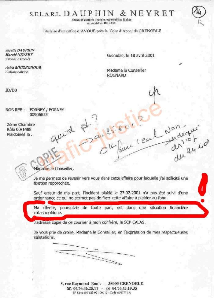 PJ : 18/04/01 L'avocat de Mme RAYMOND l'écrivait en difficulté juste après son pot-de vin de 80.000 euros (valeur 2017)