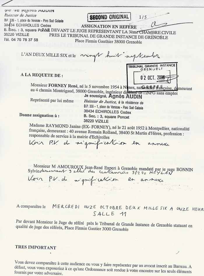 Retour ASSIGNATION EN REFERE au 11 octobre 2006 pour récuser l'expert Jean Réné AMOUROUX sourd et aveugle.
