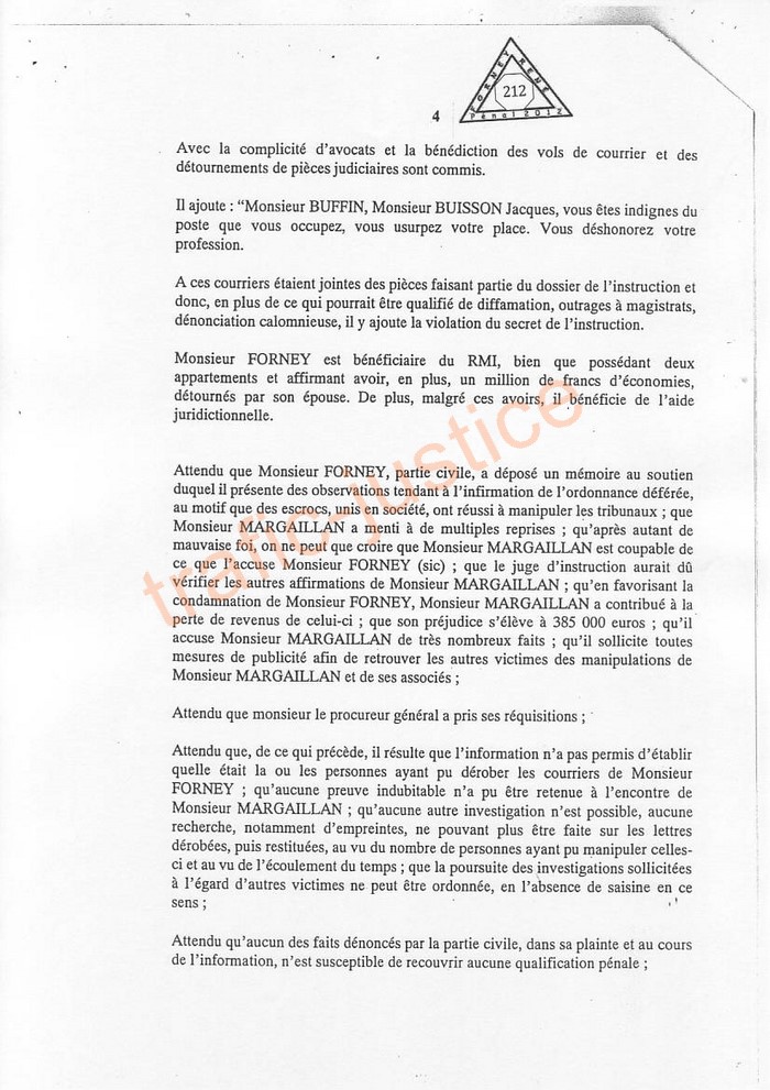 | Voir conclusions sur 4 juges corrompus et pièces 1, 2, ... , 109 , 110 , 111 , 201, 202 , 203, ... 224 , 225 , ..., 229, 230 Liste Remarquez le juge mafieux radié Didier DURAND encore présent ici, complicité Bernard BUFFIN | |