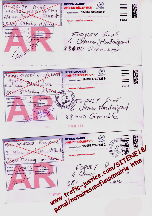 MÉMOIRE DEVANT LA CHAMBRE DE L'INSTRUCTION À l'appui de l'appel de l'ORDONNANCE du REFUS d'INFORMER du 5 mars 2012 du juge d'instruction Mme MAS Marie-Laure PLAISE À LA COUR POUR : Monsieur René FORNEY, né le 05 novembre 1954 à Nîmes - 30-(Gard) de nationalité Française, demeurant au 4, Chemin Montrigaud, 38000 Grenoble. Ingénieur en métallurgie en recherche d'emploi. CONTRE : Me REBERT Myrtille notaire, Me DESCHAMPS Yves notaire, ESCALLIER Bruno notaire, Mme MINGAUD-FAVRE Françoise Louise Marie Thérèse, Mme RAYMOND Janine Fernande, M et Mme SAVARY Eric / LEPORT Agnès, M. PROBY René maire, Me JACQUOT Dominique notaire (Pièce A) et complicités. I M. FORNEY EXPOSE DES FAITS et le CONTEXTE GLOBAL : Par ma plainte du 2/04/10 (pièce 108) et ma relance du 26/07/10, j'ai mis en cause des notaires et des complicités pour avoir facilité le détournement de mon bien immobilier avec mes droits sur l'autre partie en copropriété. Le Procureur PHILIPPE Jean a classé sans suite au motif du 2/07/10 "une possible erreur n'est pas une faute pénale" . Mme MAS a instruit deux ans ma constitution de partie civile du 20 août 2010 pour rendre ce refus d'informer du 5/03/12. Cette plainte fait suite à ma découverte en 2010 au bureau des hypothèques d'un faux acte notarié signé par PROBY René pour le compte de la mairie de St Martin d'Hères. Ce faux ne peut être dû à des erreurs puisque les notaires ont recopié plusieurs extraits volontairement tronqués de l'acte du 10 décembre 1981 (pièce 105) établi en l'étude de Me ESCALLIER notaire à Domène concernant ma propriété au 40 rue Romain Rolland 38400 St Martin d'Hères acquise sur mes fonds propres (pièce 19). De plus, le principal travail d'un notaire est de rechercher les ayant droits avant d'écrire tout acte concernant des biens immobiliers.